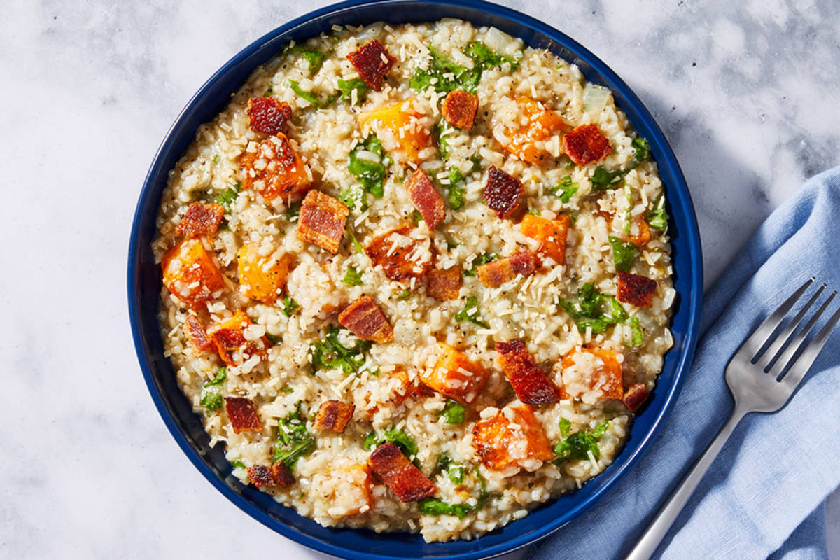 Ingredients: Butternut squash • Arborio rice • Bacon (pork, water, salt, sugar, sodium phosphates, sodium erythorbate, sodium nitrite, spices, smoke) • Parmesan cheese (pasteurized milk, modified milk ingredients, water, modified corn starch and/or potato starch, cheese (milk, bacterial culture, salt, microbial enzyme, lipase), salt, citric acid, sodium phosphate, lactic acid, flavour, sodium citrate, potassium sorbate, caramel colour, beta-carotene, anticaking blend (potato starch, corn starch, dextrose, calcium sulfate, cellulose, natamycin, enzyme)) (milk) • Yellow onion • Spinach • Chicken broth concentrate (sugars (maltodextrin, sugar), chicken stock, chicken fat, chicken flavor (chicken broth, salt, flavoring, water, glutamic acid, chicken fat, chicken powder, xanthan gum, organic sunflower oil), salt, yeast extract, xanthan gum, natural flavor) • Garlic puree (garlic, water, soybean oil, citric acid, phosphoric acid, xanthan gum, potassium sorbate, sodium benzoate) • Italian herb spice blend (salt, dehydrated onion, dehydrated garlic, herbs, sugar, onion powder, garlic powder, canola oil, silicon dioxide) (sulphites).