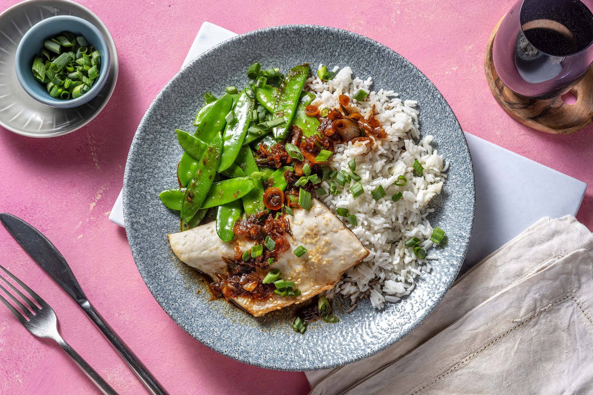 Séparer les grains de riz à la fourchette, puis répartir dans les assiettes. Servir le barramundi et les pois sucrés en accompagnement. Napper le tout de la sauce soja au beurre. Parsemer du reste des oignons verts.