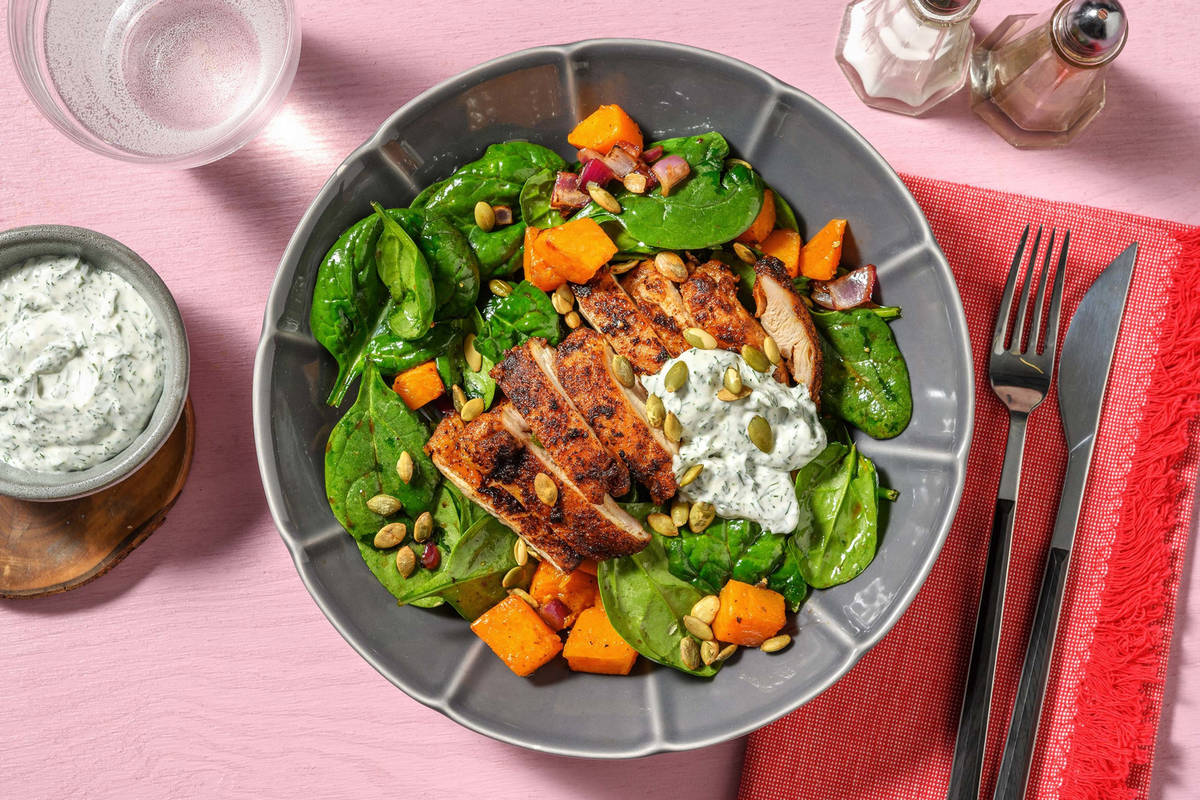 Thinly slice chicken. Divide salad between plates and top with chicken. Spoon dill sauce over chicken and sprinkle with pepitas.