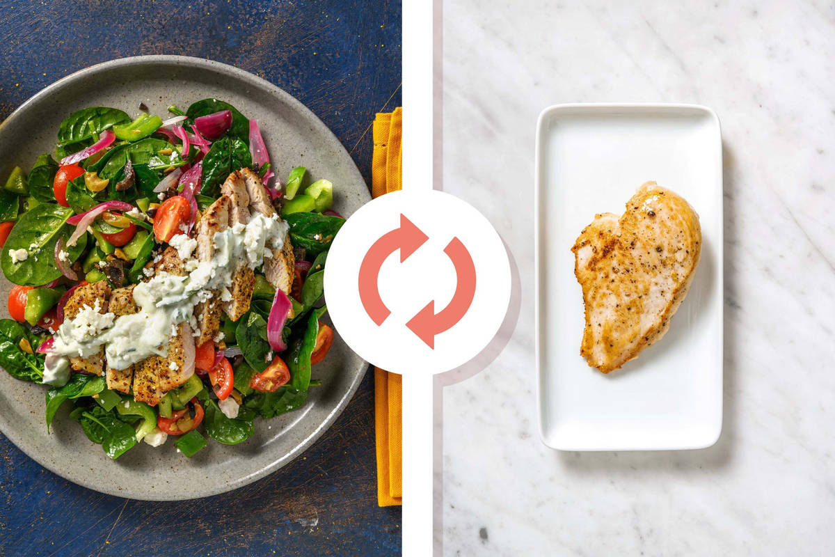 Inspired by the flavours of classic Greek cuisine, this lower-calorie dish pairs juicy lemon-pepper chicken breasts with Greek-style salad and creamy yogurt sauce.