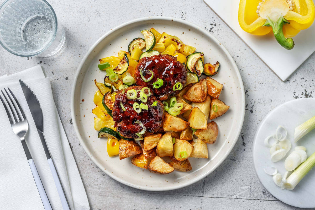 Tender turkey patties smothered in a sweet soy glaze rest on a bed of roasted veggies to round out this vibrant and balanced plate!