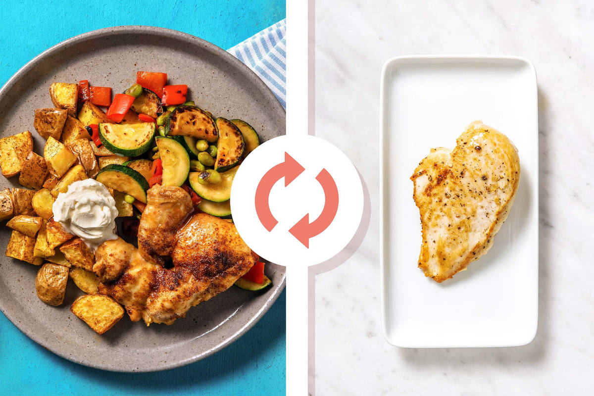 While potatoes roast, pat chicken dry with paper towels. Add chicken, remaining BBQ Seasoning and 1/2 tbsp oil (dbl for 4 ppl) to a foil-lined baking sheet. Season with salt, then toss to coat. Roast in the top of the oven until chicken is almost cooked through, 14-16 min. (NOTE: The chicken will finish cooking in step 5.)