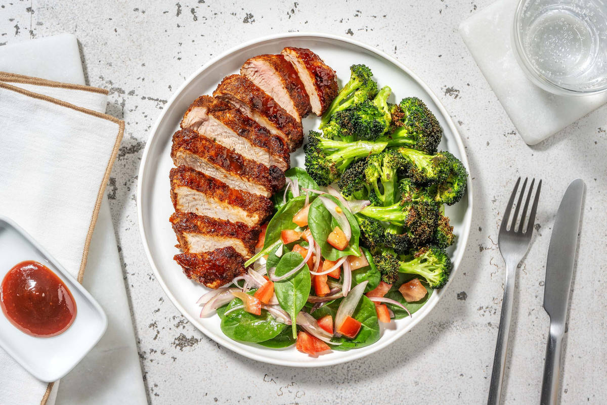 Slice BBQ-rubbed pork.Divide pork, salad and roasted broccoli between plates.Serve remaining BBQ sauce on the side for dipping.