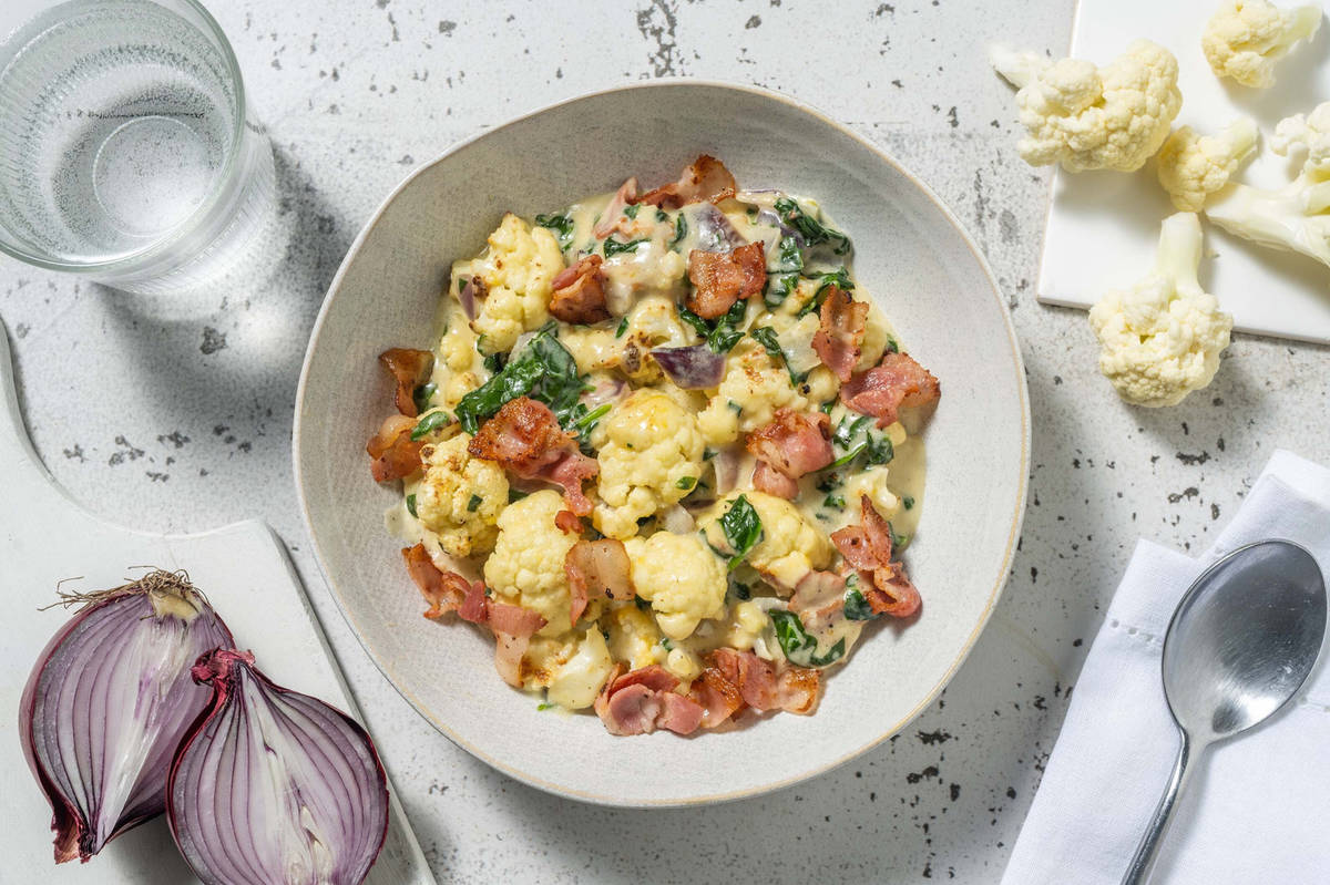 Drain and discard all but 1 tbsp (2 tbsp) bacon fat from the pan. Sprinkle Cream Sauce Spice Blend over bacon fat. Cook, stirring constantly, until fully combined, 30 sec. Add Dijon-cream mixture. Reduce heat to medium. Cook, stirring often, until slightly reduced, 1-2 min.Remove from heat. Add half the bacon, cauliflower and onions, cheese and spinach. Stir until cheese is melted and spinach is wilted, 1 min. (TIP: Add 1 tbsp water if sauce is too thick!)Season with salt and pepper, to taste.