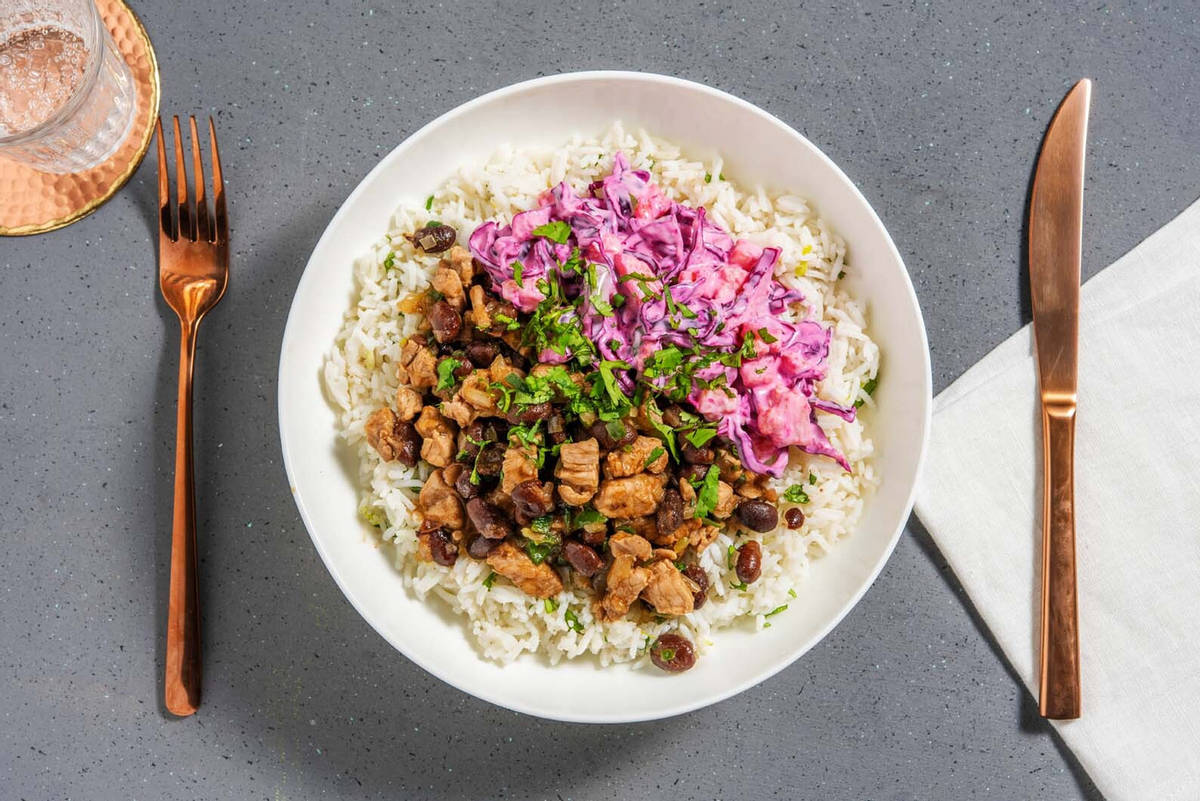 This dish is inspired by the delectable flavours of the Caribbean islands. Seasoned pork, poblano peppers and black beans sit atop aromatic coconut rice. Sweet and smoky, with a hint of spice, this meal embodies the delicious and well balanced essence of Caribbean cooking!