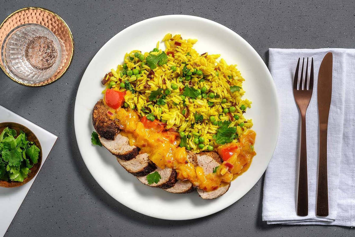 Pork tenderloin takes a trip to the tropics in this bright, zippy recipe! Caribbean-spiced pork tenderloin is nestled on a bed of golden rice, then topped with a pineapple, onion, and pepper chutney. The winning combo is tangy, rich, and savoury all at once.
