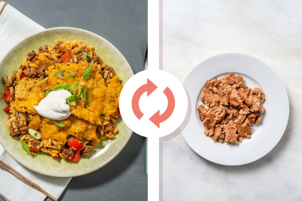 Add orzo to pan with meat. Season with salt and pepper, to taste, then stir to combine. (NOTE: If you don't have an oven-proof pan, carefully transfer mixture to an 8x8-inch baking dish [9x13-inch for 4 ppl]).Sprinkle tortilla crumble overtop.Sprinkle cheese over top.Bake in the middle of the oven until cheese is melted, 3-5 min.