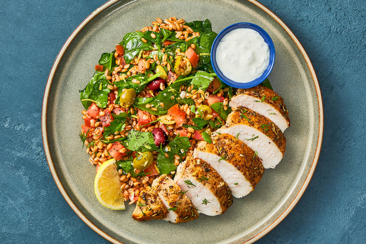 Ingrédients : Poitrines de poulet biologique • Tomate Roma • Farro (blé) • Citron • Olives mélangées (olives vertes dénoyautées, olives kalamata dénoyautées, eau, sel, acide lactique, sorbate de potassium, vinaigre, chlorure de calcium) • Épinards • Sauce au yogourt (lait) (crème, lait pasteurisé, concentré de protéines de lait, yogourt (lait partiellement écrémé, lait écrémé en poudre, culture bactérienne), crème acidulée (substances laitières, fécule de maïs modifiée, gomme de guar, carraghénane, gomme de caroube, citrate de sodium, culture bactérienne), concombre, ail, citron, vinaigre, fécule de maïs modifiée, eau, huile de canola, sel, poivre blanc, herbes aromatiques, sorbate de potassium) • Persil • Mélange d’épices méditerranéen (amidon de maïs, sel fin, légumes déshydratés (ail, oignon, poivron rouge), sucre, épices et herbes, semoule de maïs, acide citrique, poudre de jus de citron, huile de canola, dioxyde de silicium) • Ail.