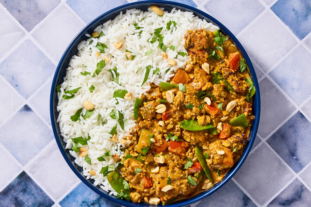 Ingredients: Ground turkey • Coconut milk (coconut extract, water) • Sweet bell pepper • Jasmine rice • Red curry paste (ginger, water, garlic, onion, sugar, soy oil, salt, lemongrass, spices, xanthan gum, citric acid, herbs, natural flavour, potassium sorbate) • Yellow onion • Snow peas • Peanuts • Vegetable stock powder (soy, sulphites) (salt, sugars (dextrose, corn syrup solids, sugar), dehydrated vegetables (sulphites) (carrot, potato, onion, leek, red and green bell peppers, cabbage, celery, tomato, garlic), hydrolyzed vegetable proteins (corn, soy), potato starch, palm oil, corn starch, yeast extract, canola oil, spice extracts, herb, turmeric extract, natural flavor) • Cilantro • Cumin-turmeric blend (cumin, turmeric, silicon dioxide).