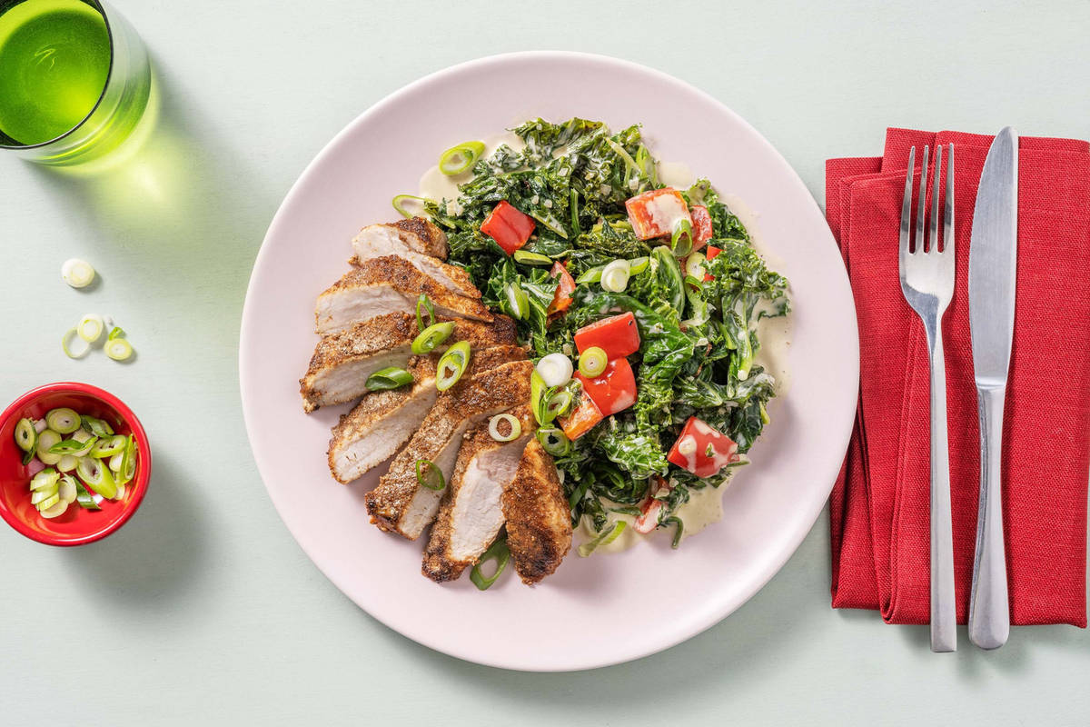 Ajouter le chou frisé et les poivrons à la poêle contenant la base à la crème. Faire cuire de 2 à 3 minutes, en remuant à l’occasion, jusqu’à ce que le chou frisé tombe. Ajouter les épinards et la moitié des oignons verts. Poursuivre la cuisson de 1 à 2 minutes, en remuant à l’occasion, jusqu’à ce que les épinards tombent. Saler et poivrer au goût.