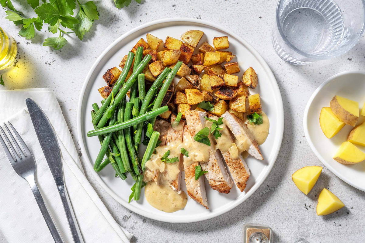 Transférer le porc dans une assiette et laisser reposer de 3 à 5 min. Parsemer les haricots verts de la moitié du persil, puis bien mélanger. Trancher le porc finement. Incorporer à la sauce le jus de cuisson du porc restant dans l’assiette. Répartir le porc, les pommes de terre et les haricots verts dans les assiettes. Napper le porc de sauce, puis parsemer du reste de persil.