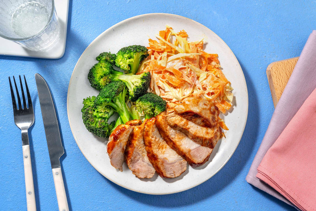 Trancher le porc finement. Répartir le porc, le brocoli et la salade de chou dans les assiettes.