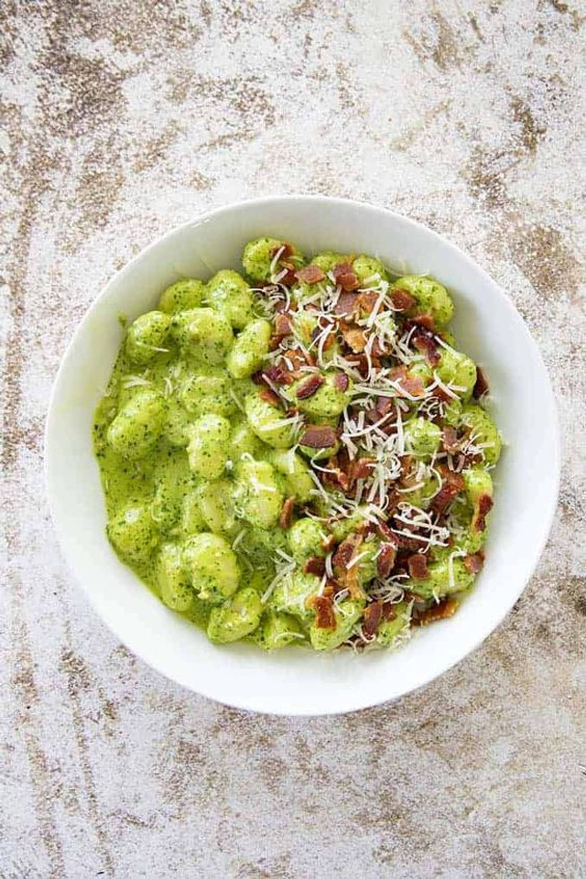 Golden pan-fried gnocchi is smothered in a basil pesto cream sauce and topped off with umami-rich bacon and toasted pepitas for a powerhouse meal.