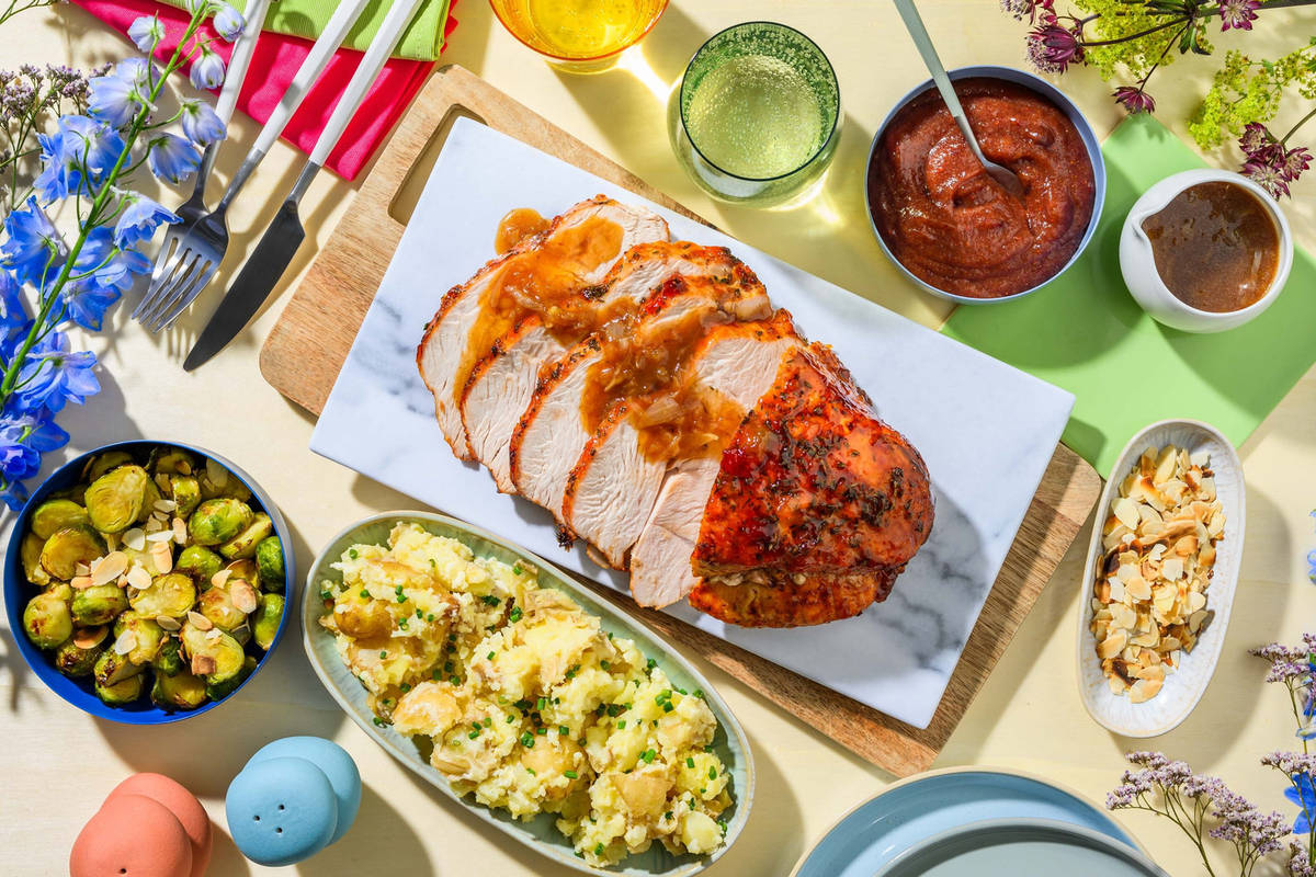 Ce soir, le festin est composé d'une dinde rôtie glacée au thym et aux canneberges, d'une purée crémeuse, d'une sauce à la dinde savoureuse et de choux de Bruxelles garnis d'amandes grillées!