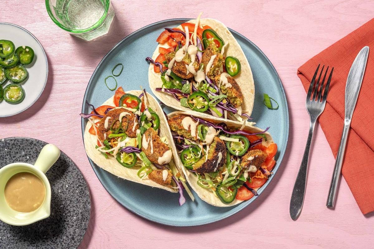 Drain pickled jalapeños, then discard pickling liquid. Pat tomatoes dry. Sprinkle sesame seeds over slaw, then toss to combine. Divide tortillas between plates. Top with tomatoes, slaw, pickled jalapeños, then falafel. Drizzle garlic tahini sauce over top. Sprinkle with remaining green onions.