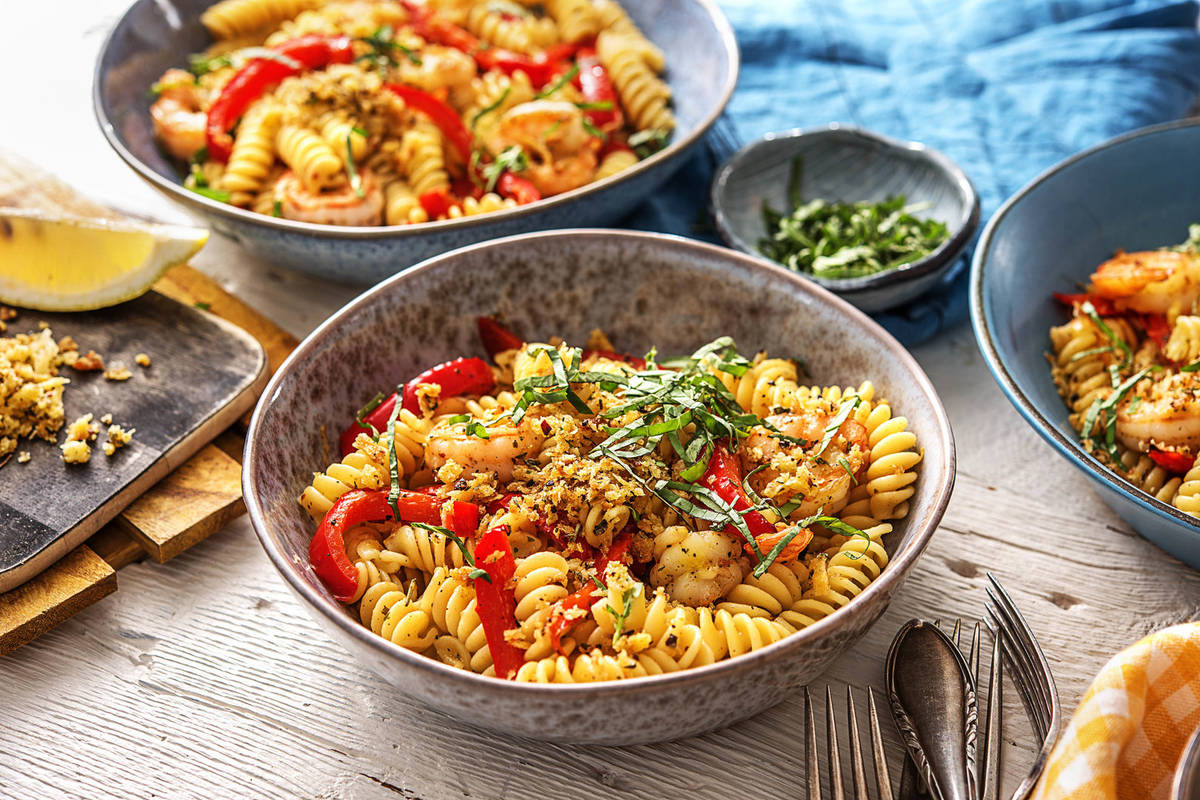 Ne vous mettons au défi de ne pas tomber fou amoureux de ces fusillis! Garnie de crevettes juteuses, de poivrons rouges rôtis et de chapelure croquante, cette recette prête en 30 minutes deviendra assurément l’un de vos coups de cœur.