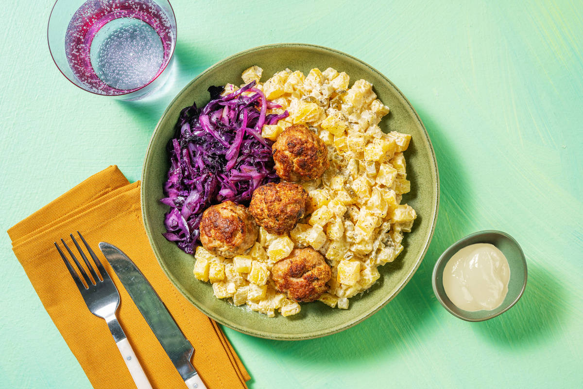 German-inspired pork meatballs pair perfectly with punchy braised cabbage and a creamy dill potato salad!