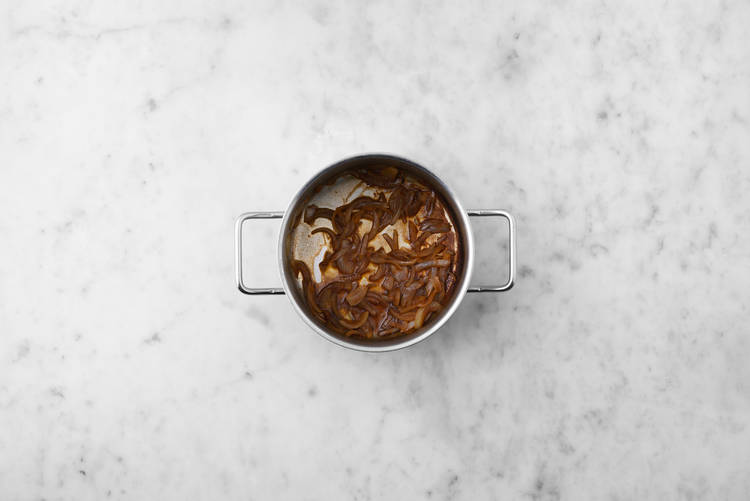 Before starting, wash and dry all produce. Peel, halve, then cut onion into 1/4-inch slices.Heat a medium pot over medium heat. When hot, add 1 tbsp butter, then onions. Cook, stirring occasionally, until golden brown, 5-7 min. Reduce heat to medium-low, then add balsamic vinegar and 1/2 tsp sugar. Season with salt and pepper. Cook, stirring occasionally, until onions are dark golden-brown, 2-3 min. Remove the pot from heat.