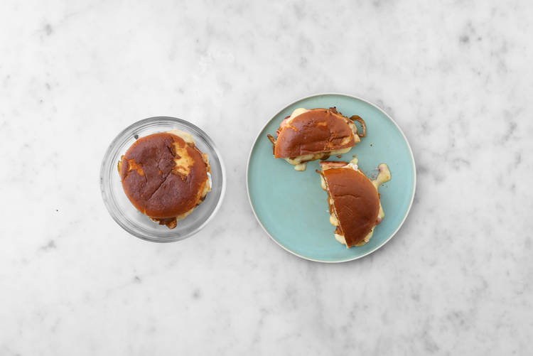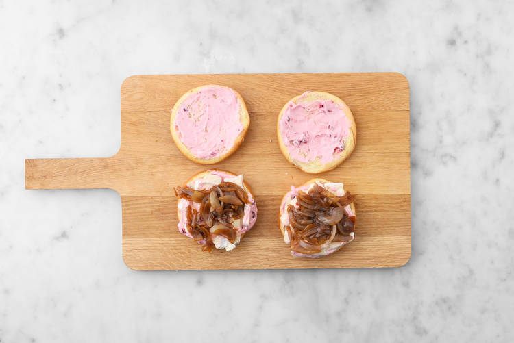 Spread cranberry mayo over both buns. Stack brie on bottom buns, then sprinkle caramelized onions over top. Close with top buns. Heat a large non-stick pan over medium heat. When hot, add 1 tbsp butter, then swirl to melt. Add sandwiches, then press down firmly on each with a spatula. Place another large, heavy-bottomed pan on top of sandwiches and cook until golden brown and cheese has melted, 3-4 min per side.