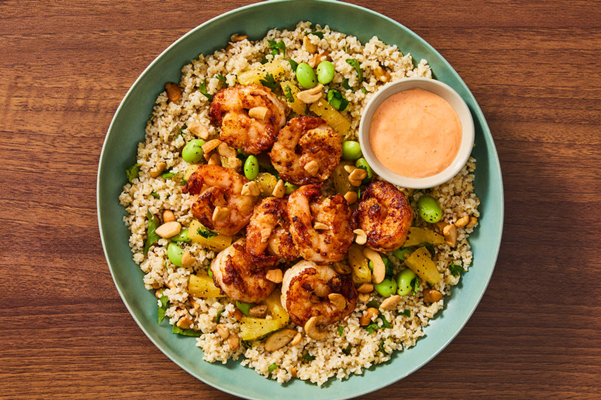 Ingrédients : Crevettes (crevettes) (crevettes, phosphate de sodium, sel) • Ananas en morceaux (morceaux d'ananas, sucres (jus d'ananas, concentré de jus d'ananas clarifié), eau, acide ascorbique, acide citrique) • Boulgour (blé) (semoule de blé dur) • Edamame (soya) • Noix de cajou • Mayo épicée (œuf, moutarde) (huile végétale, piments forts, jaune d'oeuf congelé, sucres (sucre, glucose), eau, vinaigre, sel, ail, jus de citron concentré, moutarde, gomme de xanthane, acide acétique, acide citrique, caramel, benzoate de sodium, sorbate de potassium, EDTA de calcium disodique) • Vinaigre de riz (vinaigre de riz, sucre, sel) • Farine tout usage (blé) • Coriandre • Paprika fumé (poudre de paprika, arôme naturel de fumée de caryer [huile de canola, arôme naturel (huile de soja, arôme de fumée), acide acétique], huile de canola) • Ail.