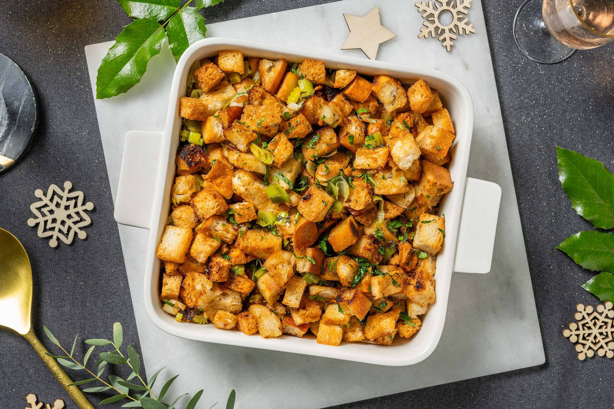 Les saveurs typiques des repas festifs sont au cœur de ce plat. Les pains grillés absorbent toute l’essence du thym, du céleri, du beurre et des poireaux, ce qui crée le parfait accompagnement pour la dinde!