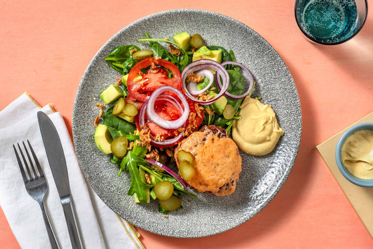 Divide the salad between plates. Top with tomatoes, onion rings, patties, pickles and crispy shallots. Dollop the Dijonaise over top.
