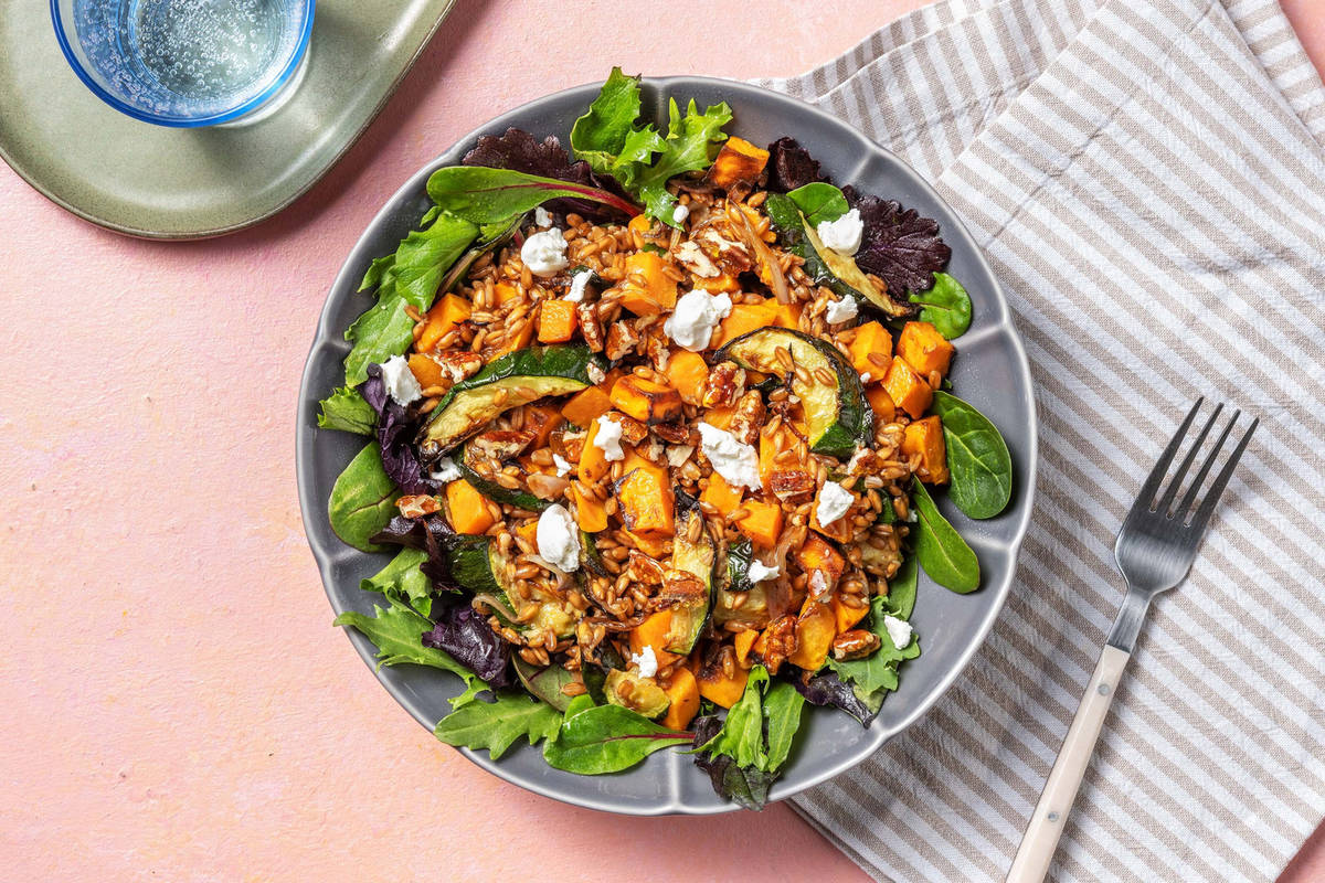 Cette salade déborde de délicieux ingrédients! La patate douce et la courgette sont accompagnées de farro copieux et de verdure fraîche, tandis que le feta et les pacanes terminent le plat en beauté. Vous en redemanderez encore et encore!