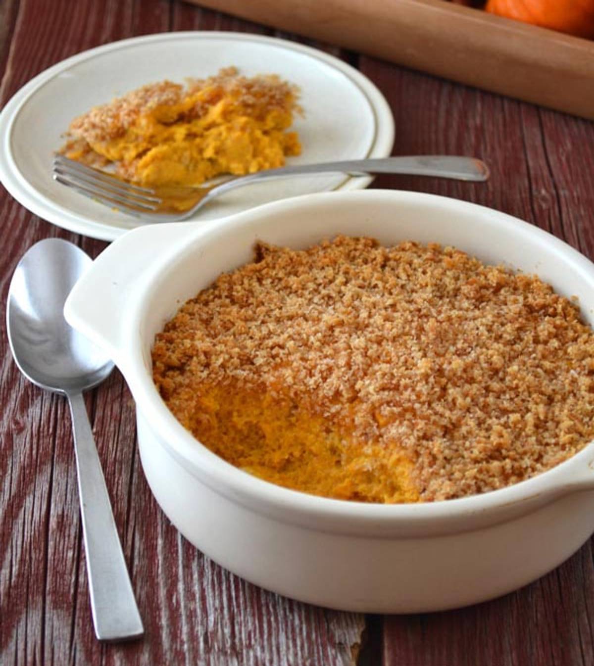 Heat a small pan over medium-low heat. When hot, add butter to melt. While butter is melting, combine squash puree, eggs, cream cheese, maple syrup and panko in a large bowl. Mix until fully incorporated and smooth.