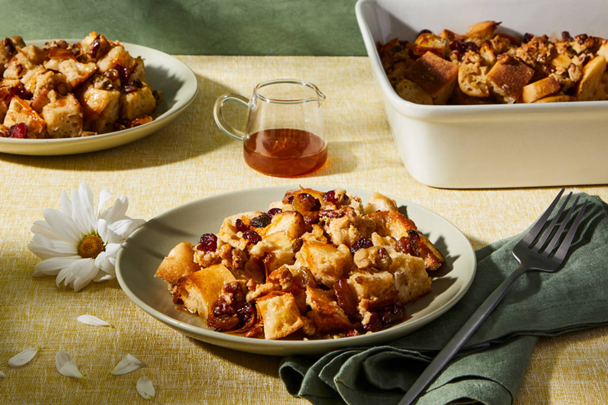 This French toast bake contains all the classic flavours of delicious Easter buns! Filled with plump dried fruit and a generous amount of pecan crumble, each mouthful contains a pleasant little surprise.