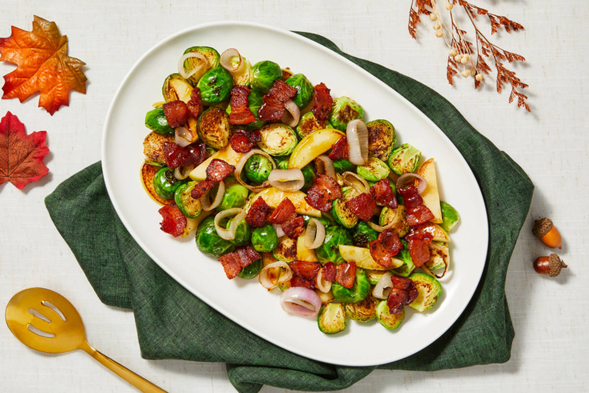 Les choux de Bruxelles parfaitement tendres sont rehaussés d’un enrobage de bacon à l’érable, d’échalotes tendres et de pommes. ' Ingrédients : Choux de Bruxelles • Pomme Granny Smith • Bacon (porc, eau, sel, sucre, phosphates de sodium, érythorbate de sodium, nitrite de sodium, épices, fumée) • Échalote • Sirop d'érable • Concentré de bouillon de légumes (eau, sucres (sucre, maltodextrine), légumes et concentré de jus de légumes (carottes, céleri, oignon, tomate), sel, huile de canola, pomme de terre séchée, poudre d'ail, poudre d'oignon, arôme naturel, extrait de levure, acide lactique, caramel, sorbate de potassium, benzoate de sodium).
