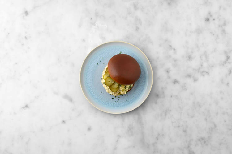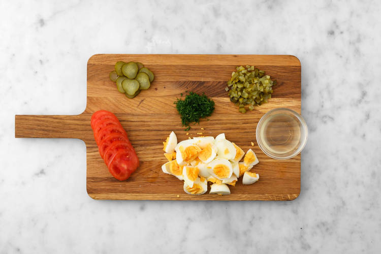 Before starting, wash and dry all produce. Gather all required tools. Drain, reserving the brine, then finely chop 3/4 of the pickles. Roughly chop dill.Cut tomato into 1/4-in slices. Season with salt and pepper.Pat eggs dry with paper towel, then cut into 1/2-inch pieces.