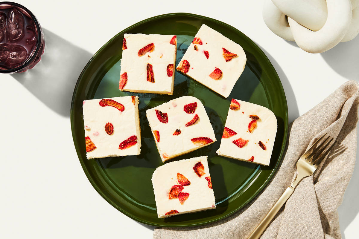 Treat yourself while keeping keto with this decadent cheesecake. The filling combines strawberries and vanilla with cream cheese, sour cream, eggs, and a zero-calorie monk fruit sweetener, which is then poured into a vanilla almond flour crust. It’s finished with a sprinkling of freeze-dried strawberries and then baked until creamy, luscious, and satisfying.