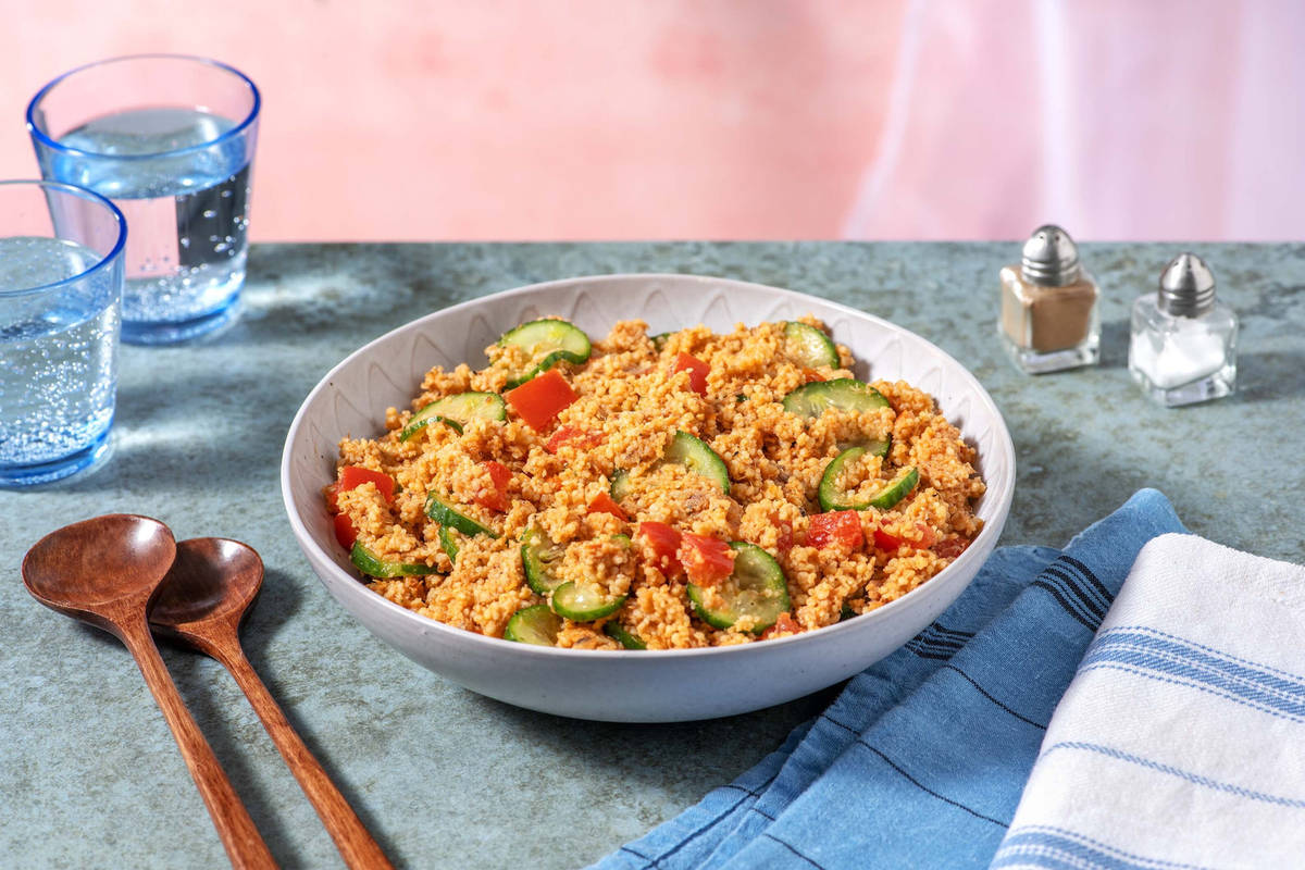 Fluff couscous with a fork. Add pesto, tuna, cucumbers and tomatoes to couscous. Season with salt and pepper, then stir to combine.