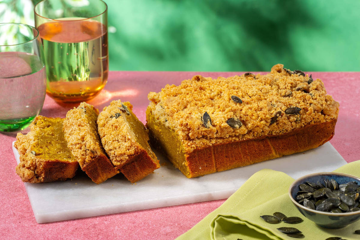 This soft pumpkin loaf with crunchy pepita crumble is an easy weeknight bake to get you in the mood for fall. With a tender crumb and plenty of warming spices like cinnamon, ginger and cloves, it will have your kitchen smelling amazing in no time!