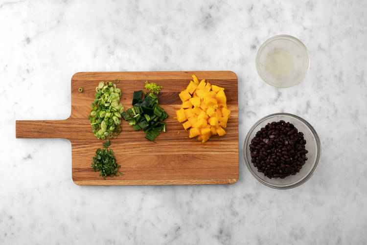 Before starting, wash and dry all produce. Gather all required tools. Thinly slice green onion. Peel, pit, then cut mango into 1/2-inch pieces. Zest, then juice lime. Core, then cut poblano into 1/4-inch pieces, removing seeds for less heat. (TIP: We suggest using gloves when prepping poblanos!)Drain and rinse black beans, then pat dry with paper towels. Roughly chop cilantro.