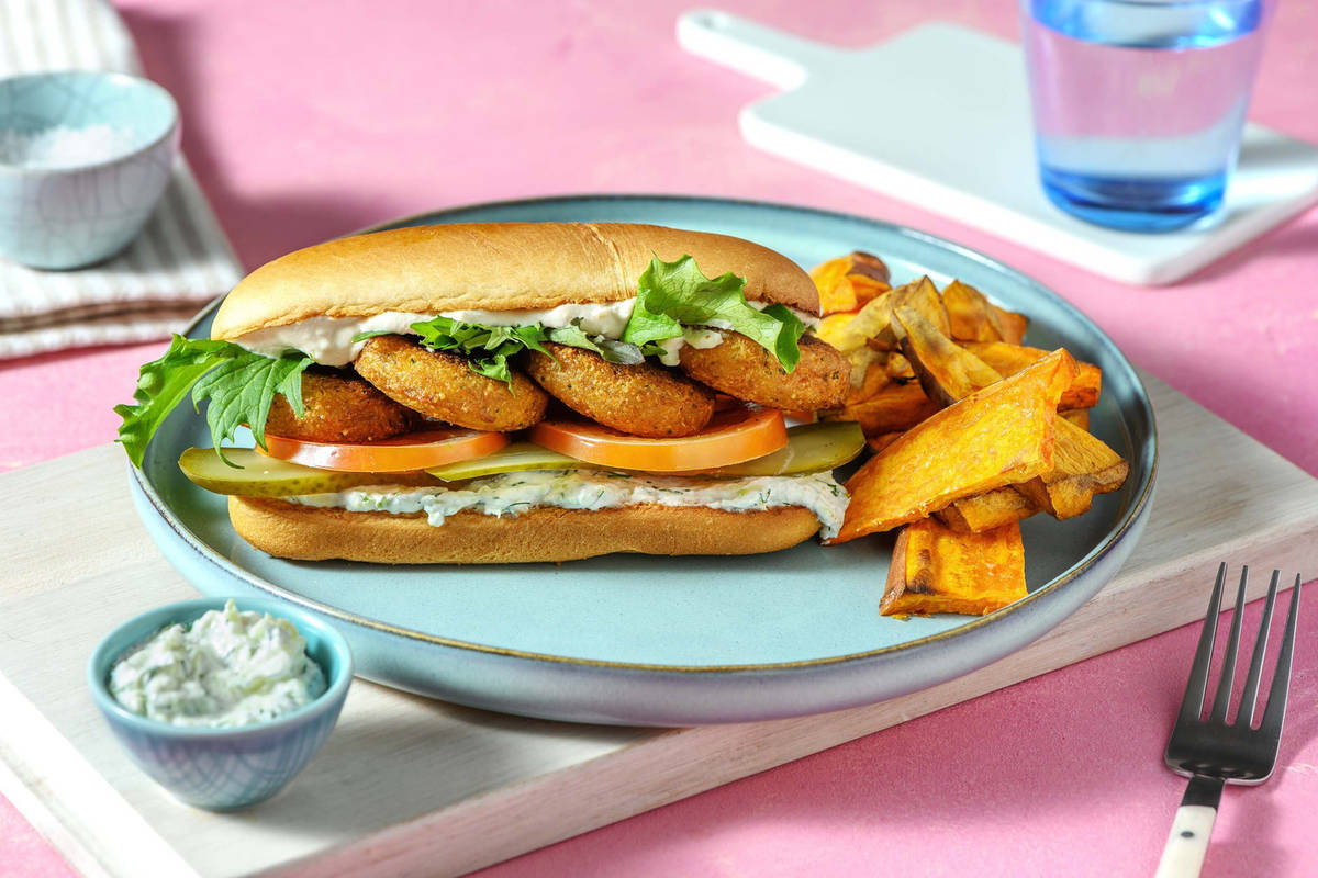We're celebrating veggie night with this Mediterranean-inspired burger! Packed with pan-fried falafel, creamy hummus, briny pickles, spring mix and DIY tzatziki, we've checked off every flavour box!