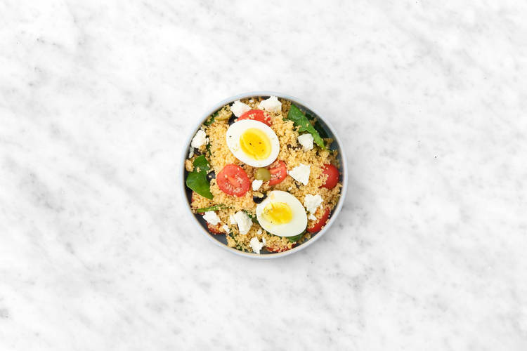 Fluff couscous with a fork. Add tomatoes, olives, pesto, vinegar and spinach to couscous, then stir to combine. Sprinkle feta over top. Divide couscous between bowls, then top with hard-boiled egg.