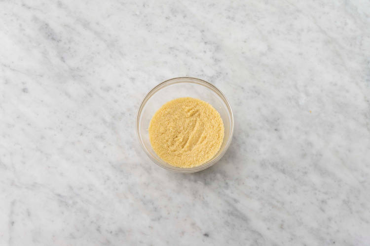 Before starting, wash and dry all produce. Bring 2/3 cup water and half the garlic salt to a boil in a small pot or in a kettle. Add couscous and boiling water to a medium bowl. Season with pepper, then stir to combine.Cover and let stand for 5 min.