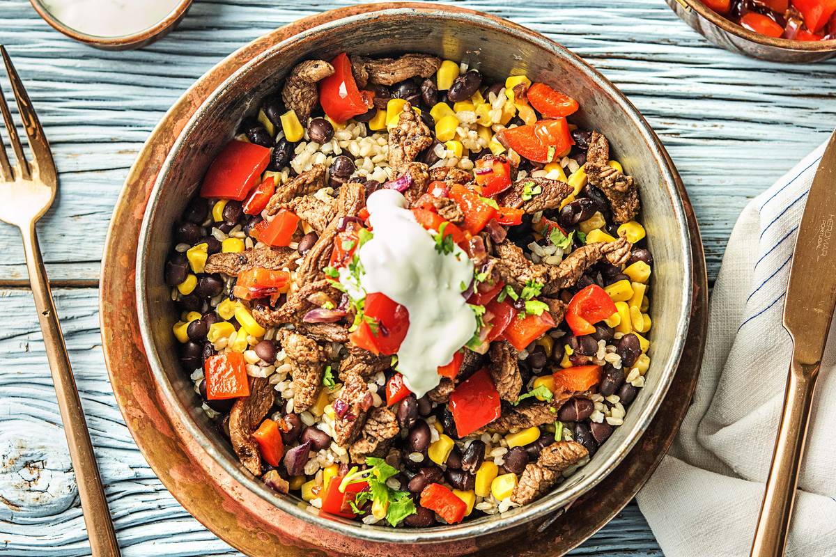 A deconstructed burrito? What fun! Delicious seared beef teams up with hearty brown rice and beans, sweet red pepper salsa and citrusy lime crema.