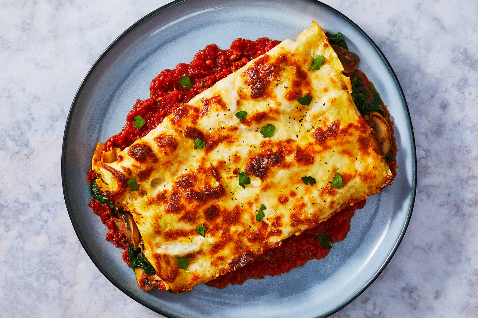 Think of this dish as a new take on Chicken Parmesan. Herbs, breadcrumbs, and mozzarella make up a crispy, cheesy coating on juicy chicken. Instead of marinara, garlicky roasted tomatoes add a sweet punch. We’ve added crispy potatoes because, why not?
