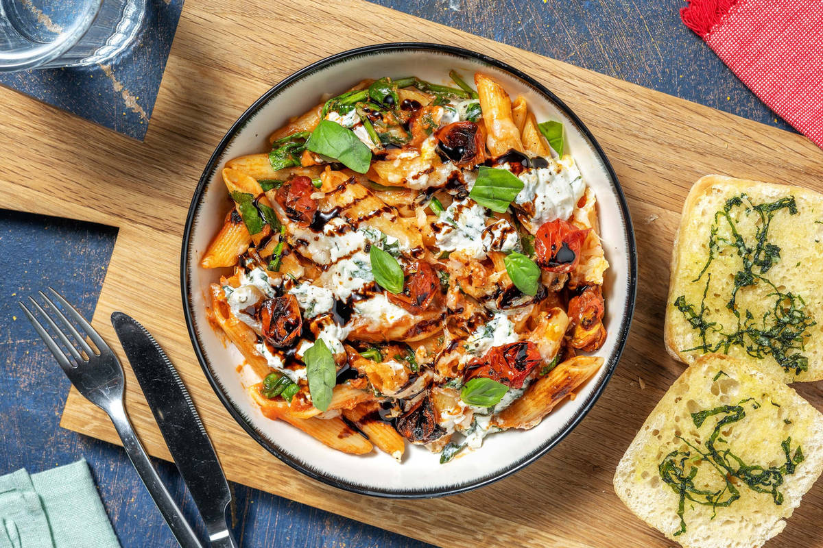 Ce plat de pennes au four déborde de saveurs et de textures qui font de chaque bouchée un vrai délice! Les pennes sont composées d’épinards au pesto de tomates séchées et sont couronnées de parmesan, de tomates rôties au vinaigre balsamique et de ricotta au basilic. Arrosez le tout d’un filet de glaçage balsamique pour donner un bon goût de douceur à chaque bouchée!
