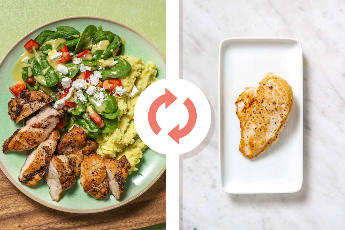 Dans cette version d’une recette classique, les poitrines de poulet juteuses sont assaisonnées d’un mélange d’épices méditerranéen et accompagnées d’une purée de pommes de terre à l’aneth et d’une salade de tomates et d’épinards frais assaisonnée d’une vinaigrette au vin rouge.