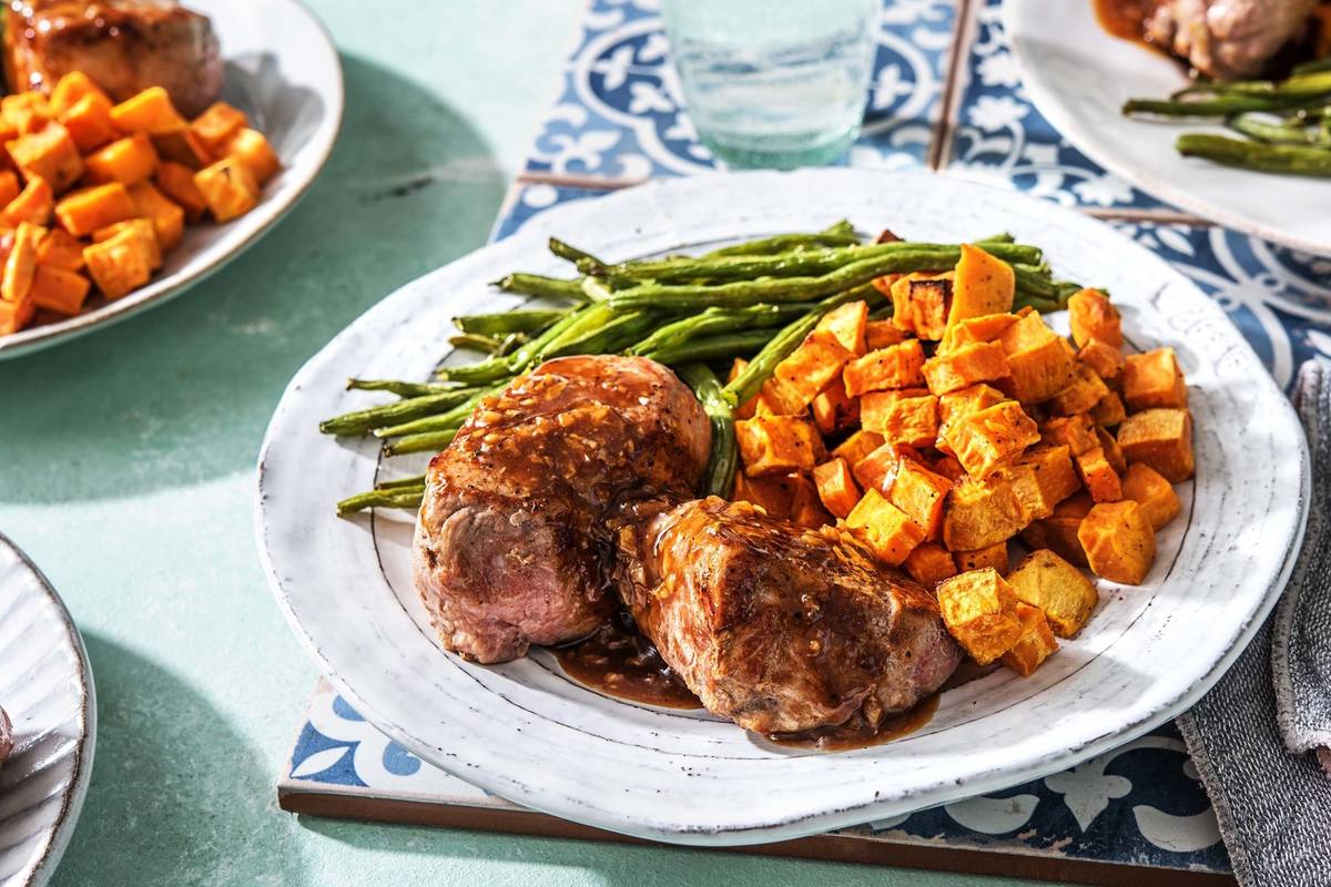 Les saveurs de la cassonade, du thym et du bouillon de poulet s’allient pour créer un délicieux glaçage sucré-salé qui rehausse parfaitement le filet de porc juteux. Ce plat savoureux est accompagné de patates douces et de haricots verts au four.