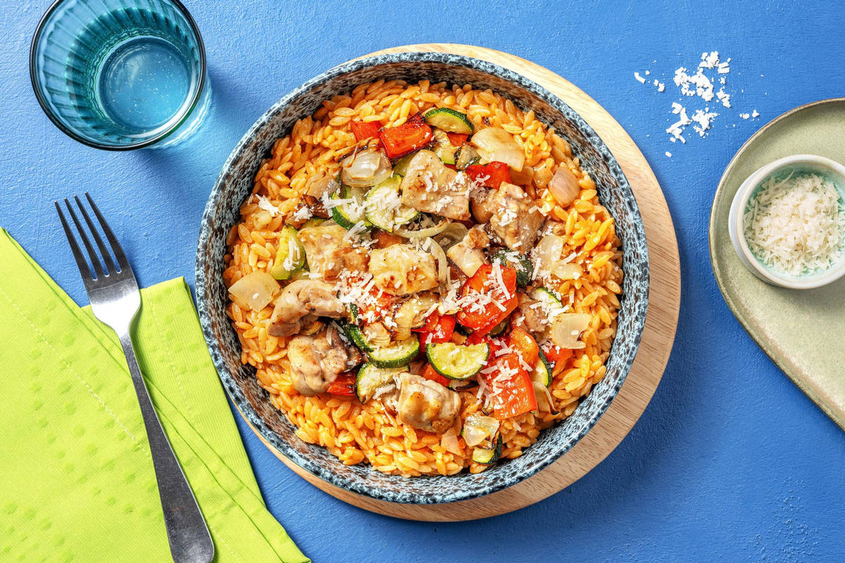 Répartir l’orzo aux tomates séchées dans les bols. Garnir du poulet et des légumes. Parsemer de parmesan.