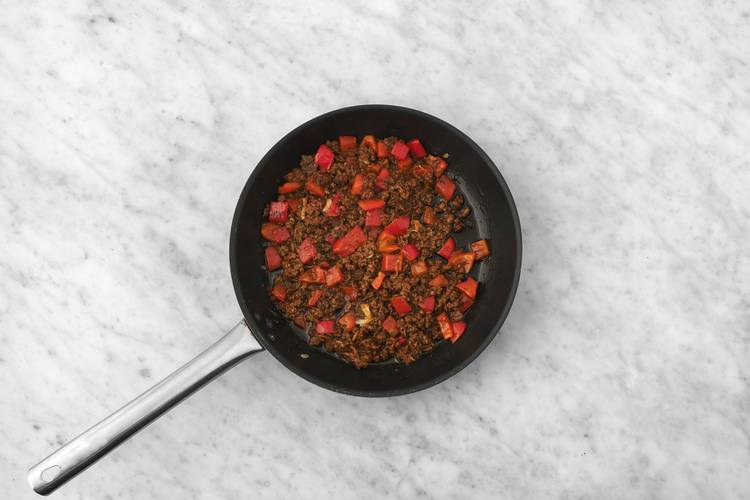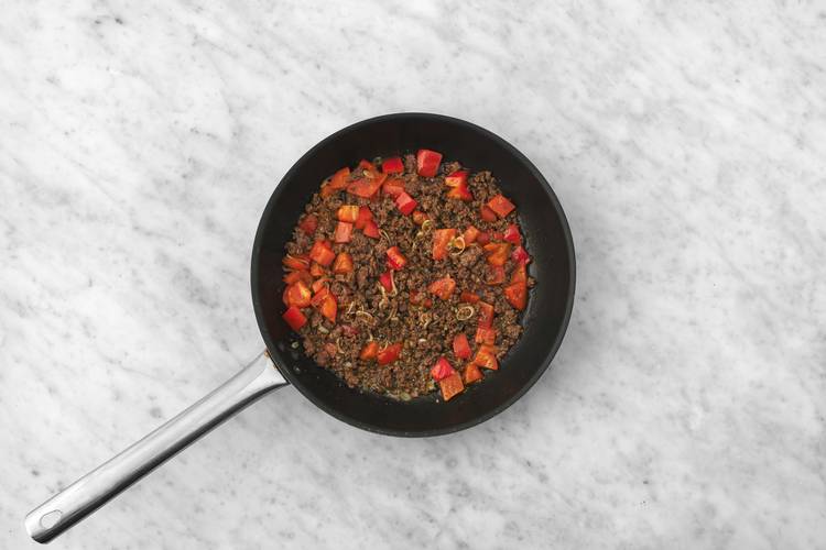 Heat a large non-stick pan over medium-high heat. When hot add 1/2 tbsp oil, then beef, peppers and green onion whites. • Cook, breaking up beef into smaller pieces, until no pink remains, 4-5 min.** Add Enchilada Spice Blend and cook, stirring often, until fragrant, 1 min. Season with salt and pepper.