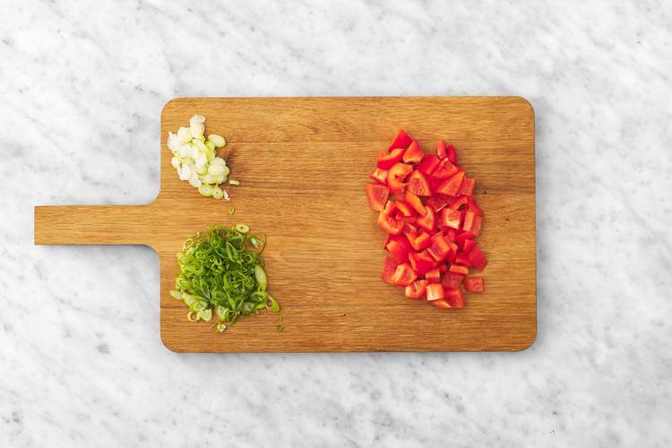 Before starting, wash and dry all produce. • Core, then cut pepper into 1/2-inch pieces. • Thinly slice green onion, keeping white and green parts separate.