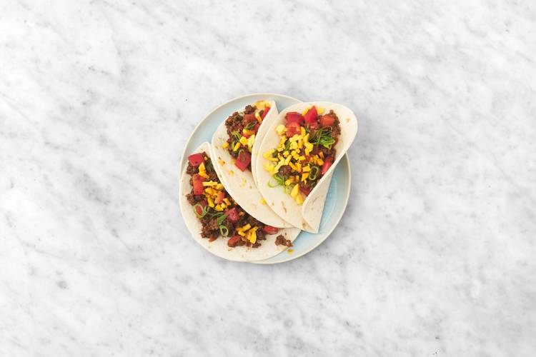 Divide tortillas between plates, then top with taco beef mixture. • Sprinkle cheese and remaining green onions over top. • Dollop sour cream over top.