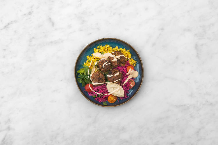 Make every bite an adventure with this colourful dish. Crispy falafel patties and chicken are served with golden, turmeric-scented rice, pickled cabbage and creamy hummus to hit all the flavour and texture notes you want.