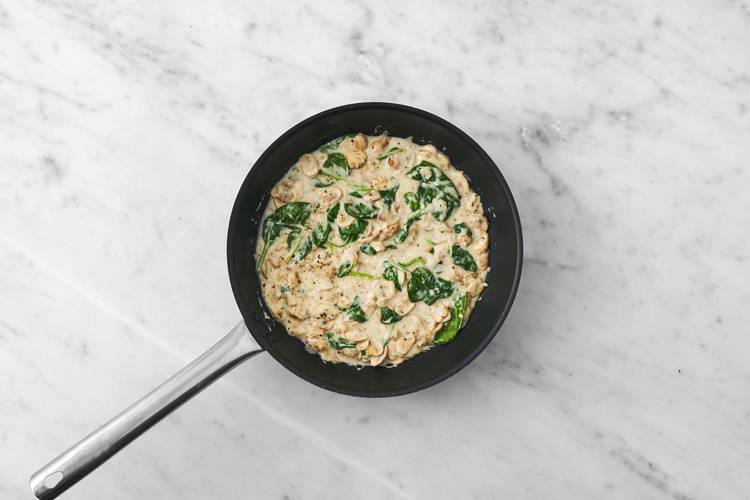• Saler et poivrer, puis remuer pendant 1 min, jusqu’à ce que les épinards tombent. (CONSEIL : Pour une consistance plus légère, ajouter l’eau de cuisson réservée, de 1 à 2 c. à soupe à la fois, si désiré.)
