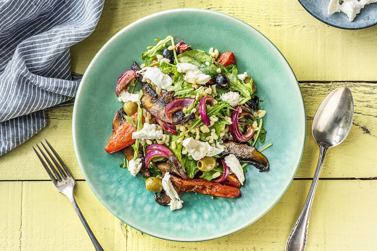 We wanted to take the best elements of a great winter stew and turn them into a 'lighter' tasting version. Warm roasted tomatoes and red onion are the perfect sweet compliment to the 'meaty' mushroom. Nutty barley rounds out the flavour with creamy bocconcini to top!